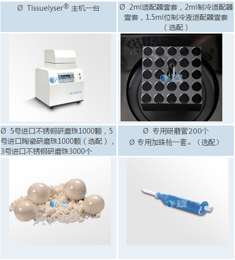 * 通常用于DNA和RNA分離的少量樣品可在一次性離心管中制備.可采用聚四氟乙烯材料制成的適配器,容納5或10個一次性樣品試管,進(jìn)行細(xì)胞破碎.在多樣品組織研磨機(jī)中細(xì)胞組織在極短的時間內(nèi)得到快速而有效的破碎,因而無需額外的低溫制冷